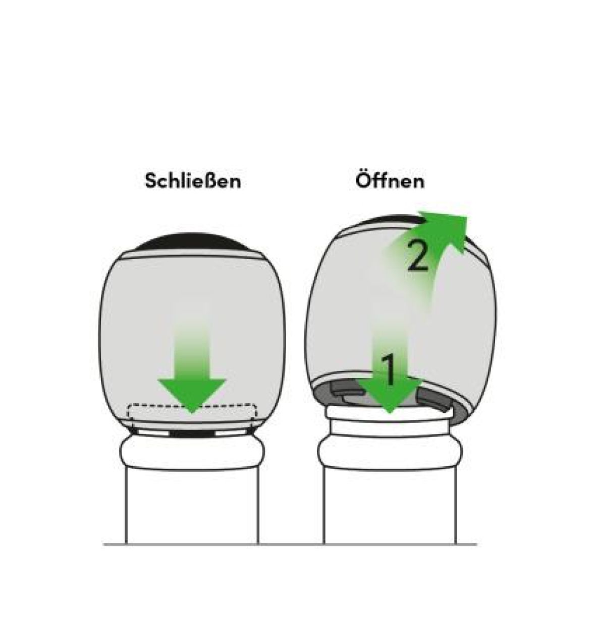 Eenvoudig in gebruik: plaats de stopper op de fles en druk hem horizontaal naar beneden. Wil je de fles weer openen? Druk opnieuw horizontaal en kantel de dop opzij – zo simpel is het.