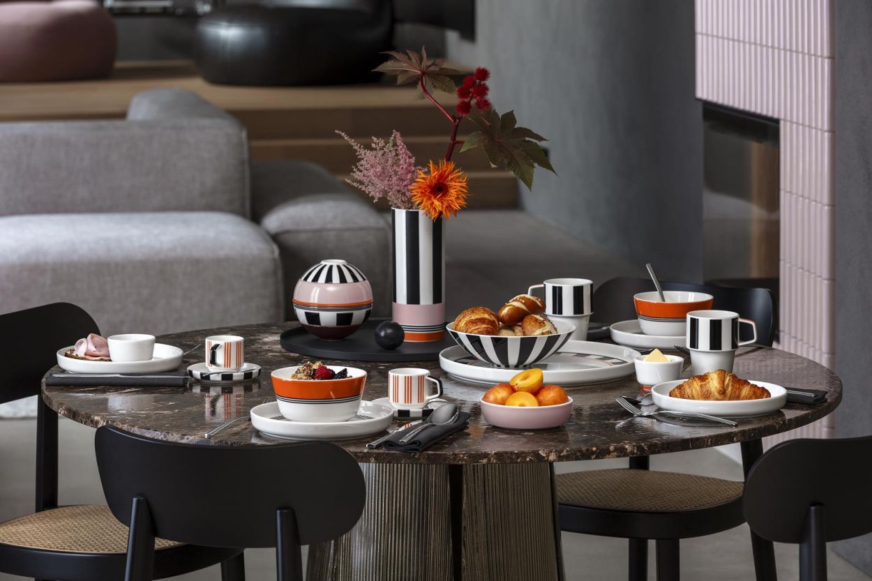 Vergeet beige borden en brave tafels. De Memphis-reeks is een visuele trip: kleurblokken, asymmetrische vormen en grafische knipogen die je tafel omtoveren tot een designstatement.