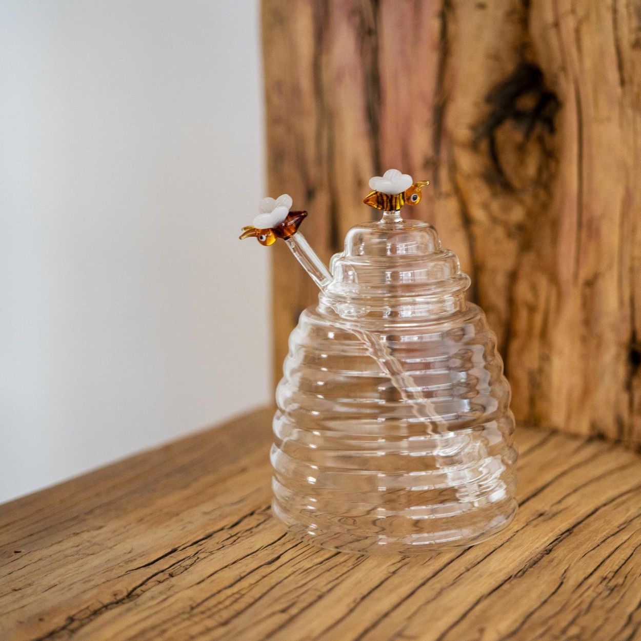 Deze unieke honingpot is niet alleen superhandig, maar ook een echte blikvanger. Versierd met met de hand geblazen glazen bijtjes, is elk exemplaar een klein kunstwerk op zich. Inclusief een stijlvolle glazen lepel. Inhoud: 500 ml pure gezelligheid aan tafel!