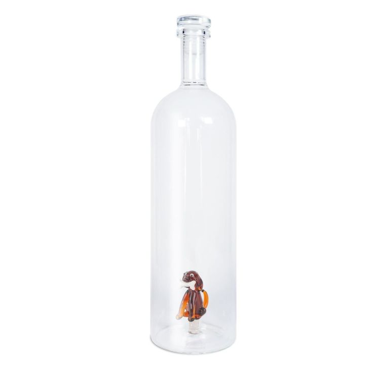 De fles heeft een luchtdichte dop en is versierd met een gekleurd figuurtje aan de binnenkant. Hij is ambachtelijk gemaakt van geblazen glas, waardoor elke fles uniek is.