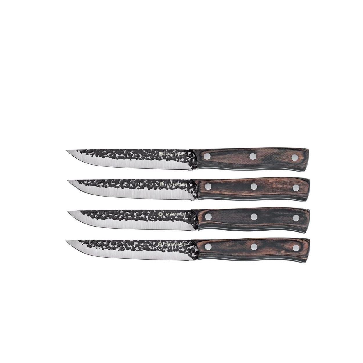 Stoer en stijlvol. Deze handgemaakte steakmessen combineren glad geslepen lemmeten met stevige grepen van pakkahout. Geen twee zijn precies hetzelfde — de natuurlijke houtnerf maakt elk mes uniek.