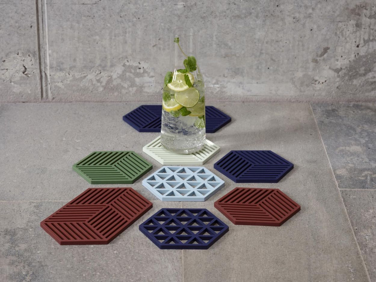 Zeg maar dag tegen saaie onderzetters. De Hexagon trivet van siliconen is even functioneel als grafisch opvallend. Zo mooi van vorm dat je ze gerust ongebruikt op tafel mag laten liggen – gewoon als decoratief detail.