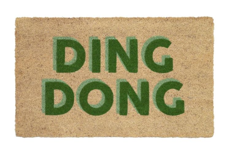Stevige cocosmat met vinyl achterkant en groene tekst DING DONG. Zorgt voor een vrolijke welkom én schone schoenen.