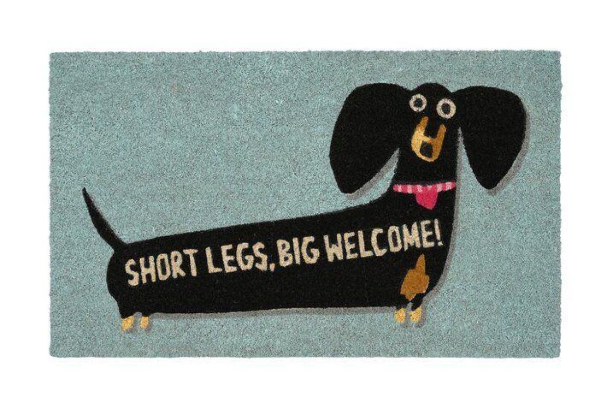 Cocosmat met vinyl achterkant, teckel en de tekst: Short legs, big welcome! Een vrolijk welkom voor iedereen.