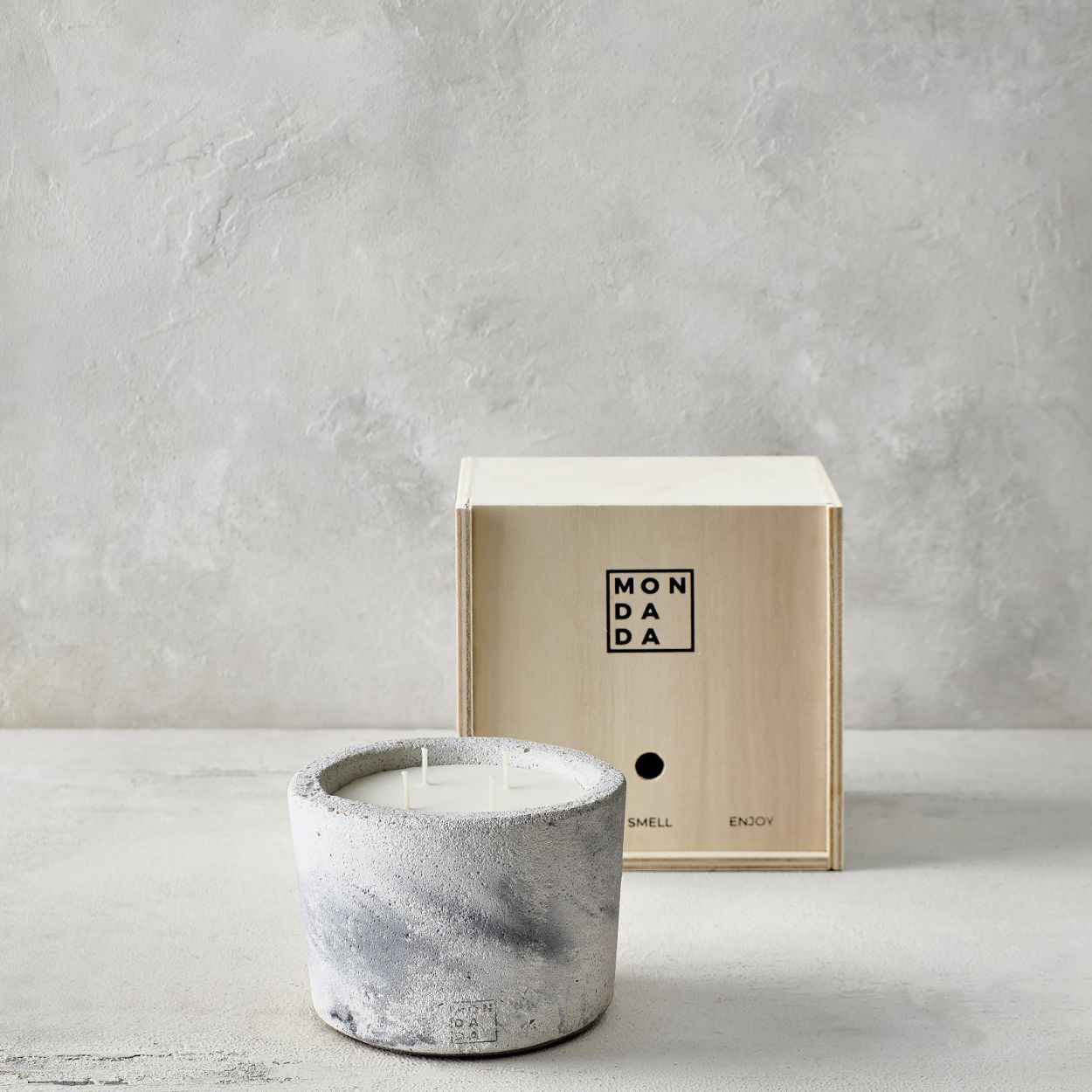 Ontdek de handgemaakte betonnen geurkaarsen van Mon Dada voor binnen. Elke kaars wordt geleverd in een luxe houten geschenkverpakking, wat het een perfect cadeau maakt.