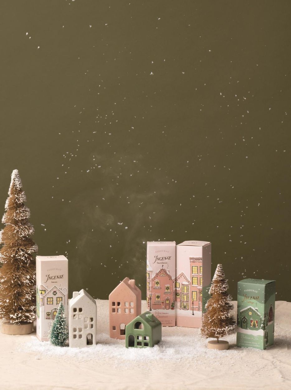 Een roze keramieken herenhuis met schoorsteen: de rook uit de schoorsteen geeft dit accessoire een levendige uitstraling. De geur van persimmon & kastanje brengt een zoet-kruidige warmte in huis.