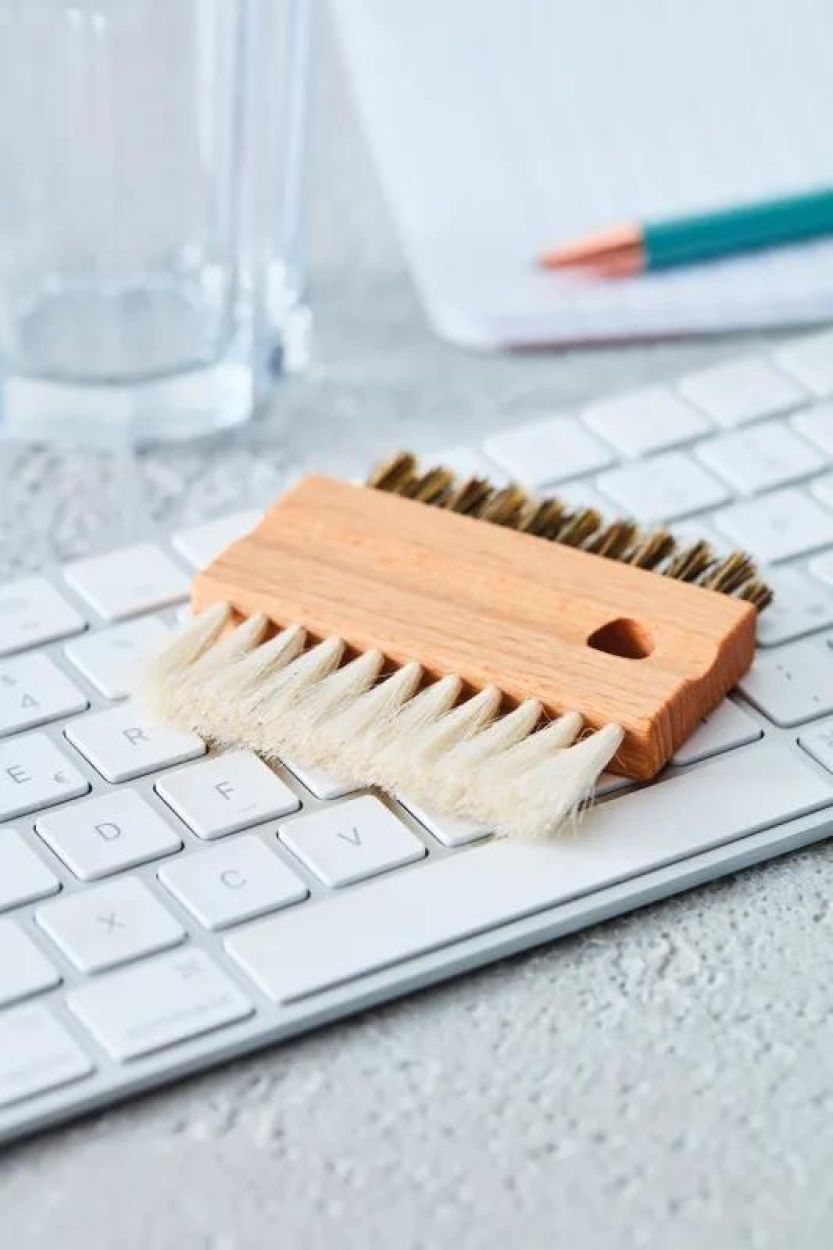 Een compacte en slimme borstel voor het schoonhouden van je computer of laptop. De zachte kant met licht geitenhaar verwijdert stof en pluisjes van het scherm en toetsenbord zonder te krassen. De harde kant met stevige, donkere haren is ideaal om tussen de toetsen te reinigen, waar vuil zich vaak ophoopt.