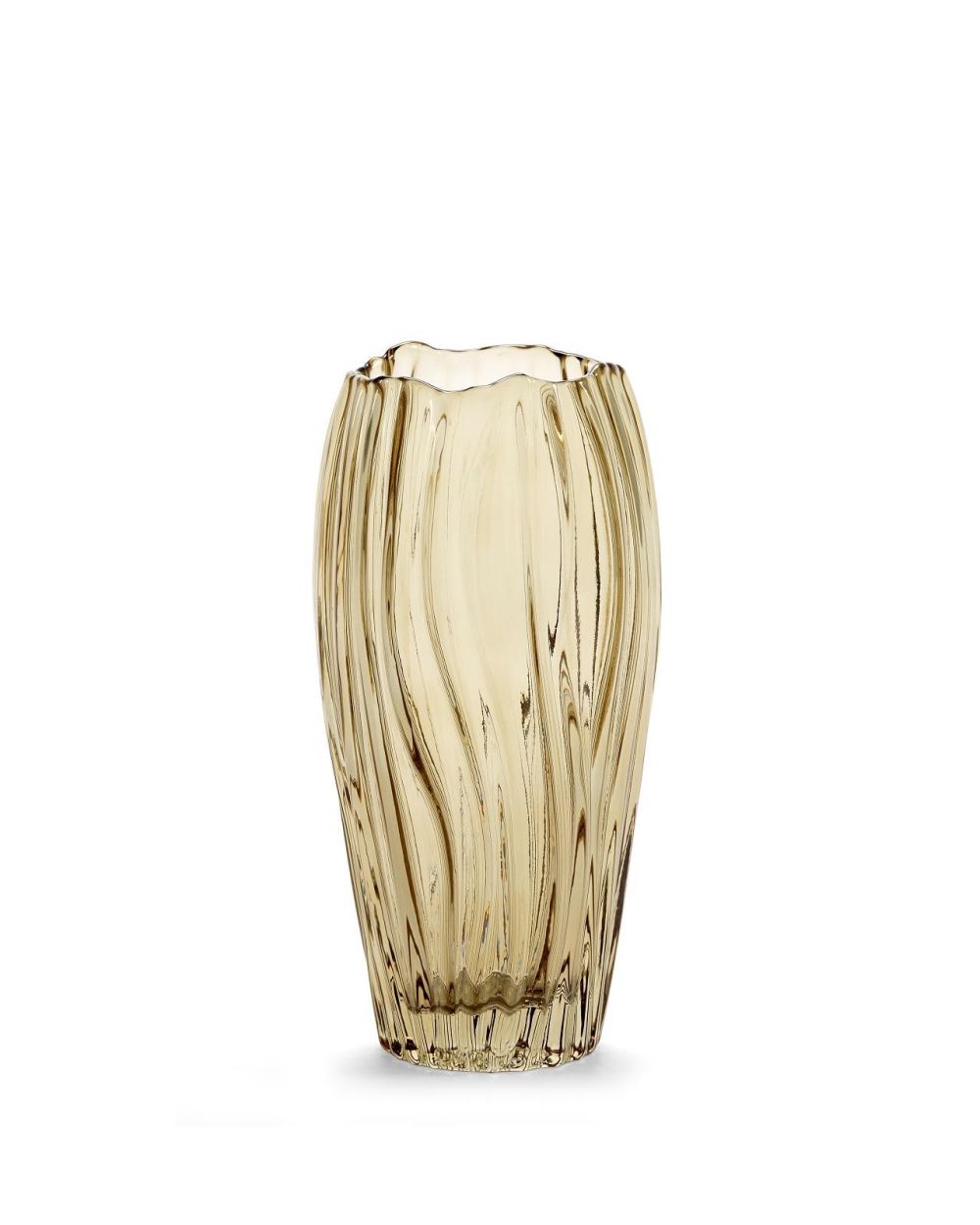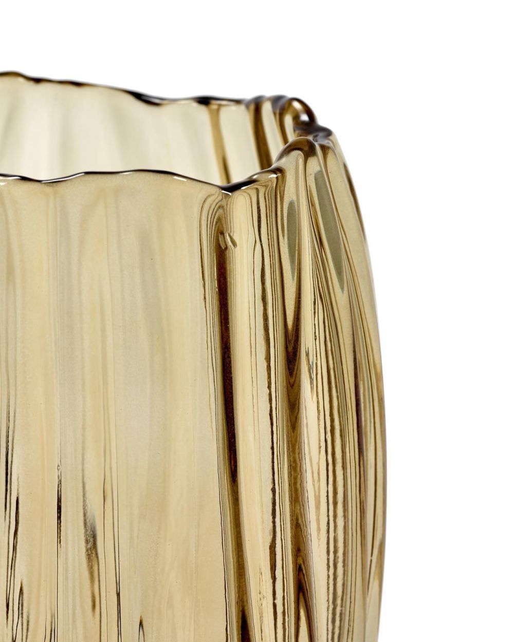 Deze vaas trekt meteen de aandacht met haar organische vorm en rijke textuur. Het ambergele glas lijkt te golven als water – een bevroren beweging vol diepte en detail.