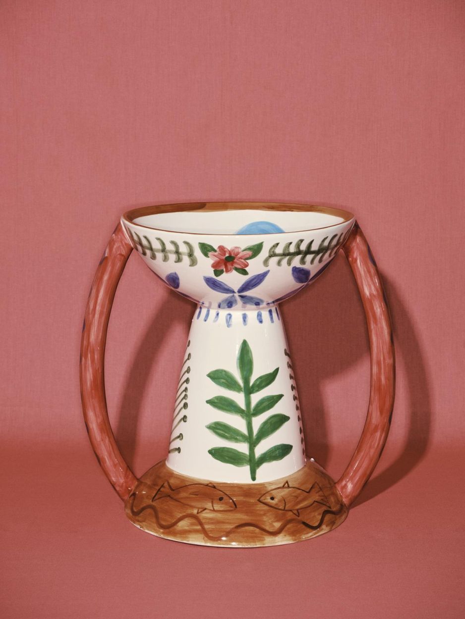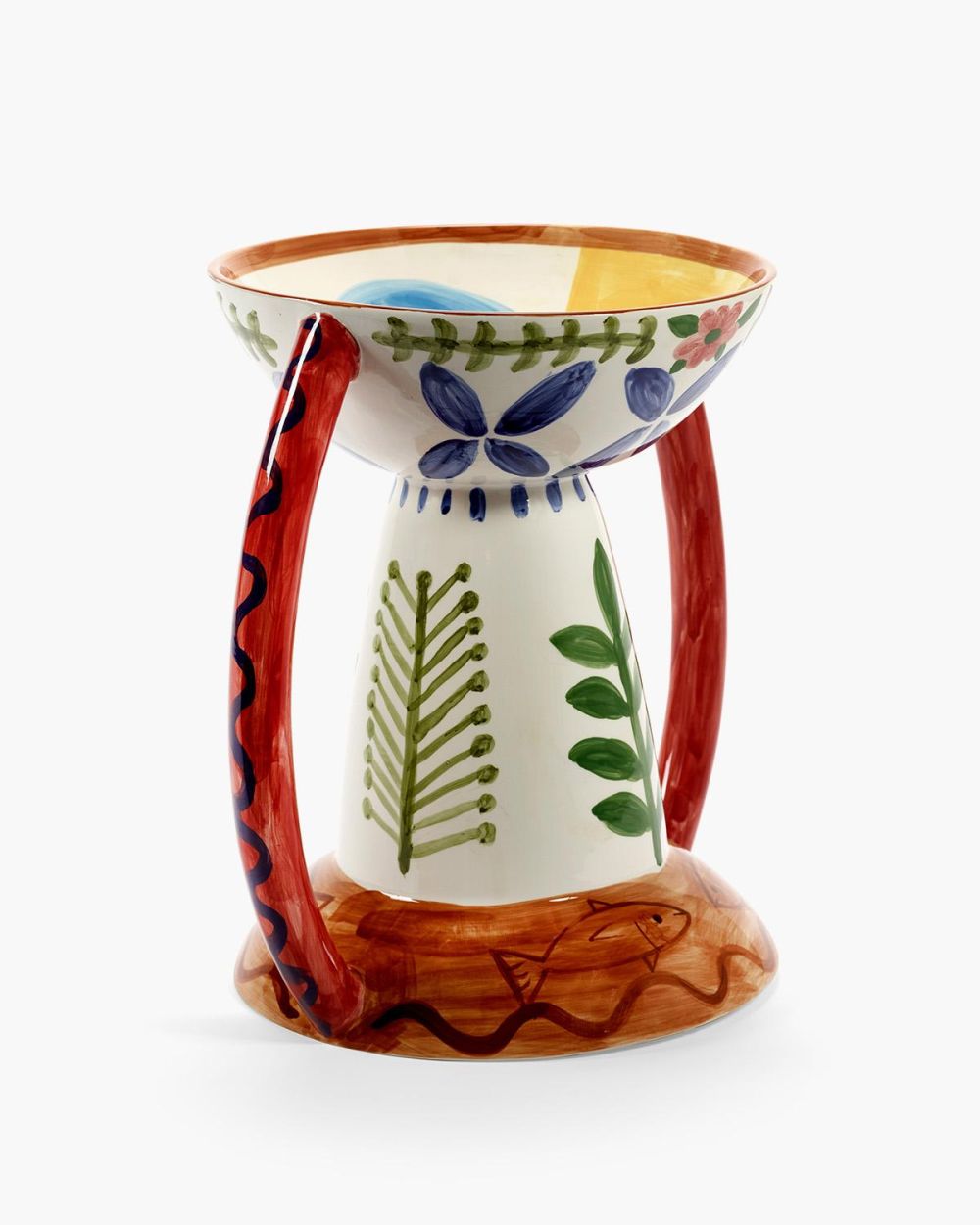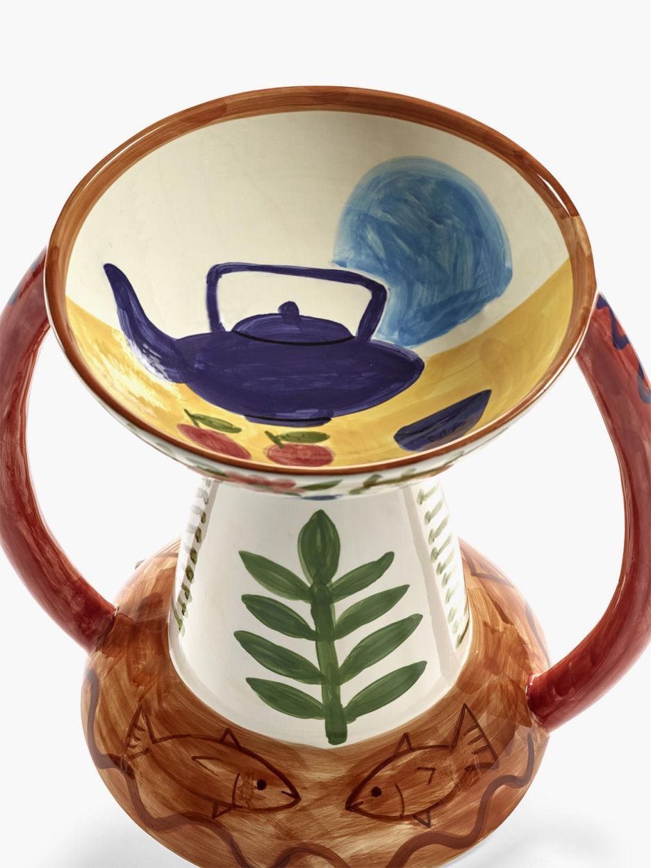 Elk stuk in de reeks is handbeschilderd en draagt de levendige, directe beeldtaal van haar schilderwerk. Tropische kleuren, speelse vormen en menselijke figuren worden vertaald naar serviesobjecten die even functioneel als kunstzinnig zijn.