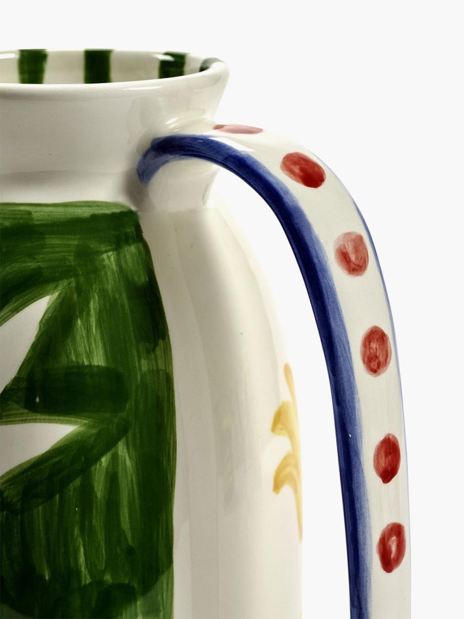 Elk stuk in de reeks is handbeschilderd en draagt de levendige, directe beeldtaal van haar schilderwerk. Tropische kleuren, speelse vormen en menselijke figuren worden vertaald naar serviesobjecten die even functioneel als kunstzinnig zijn.