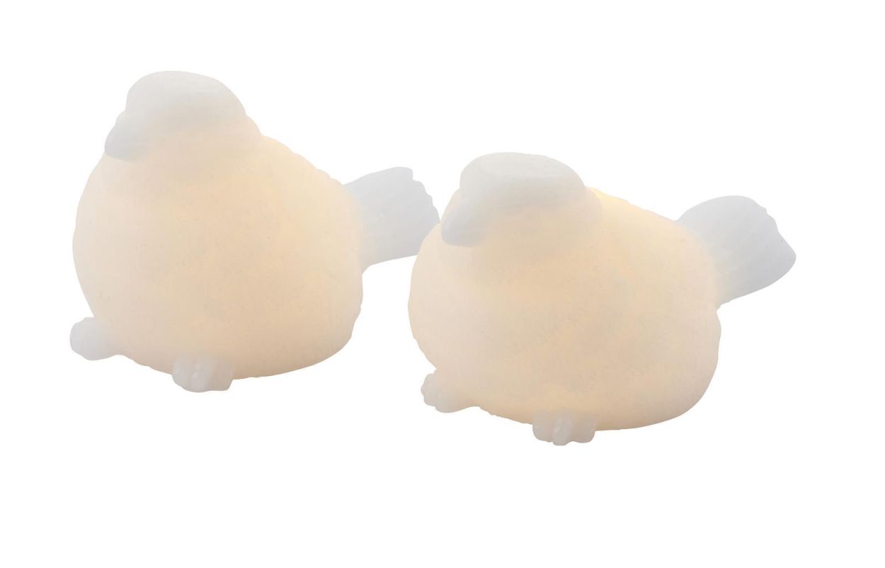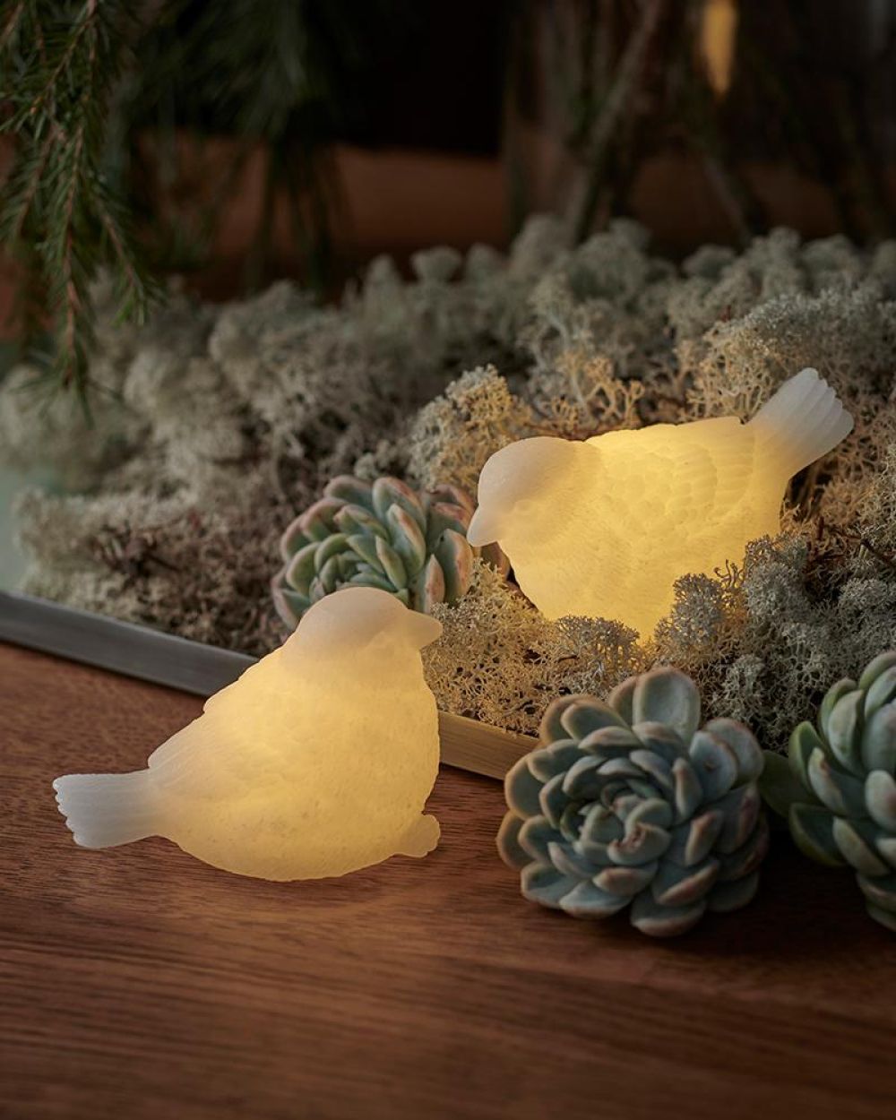 De Erica mussen van Sirius zijn een sfeervolle set van twee waxfiguren met ingebouwd LED-licht. Ze verspreiden een warme, gezellige gloed die perfect past bij winter- en kerstdecoraties met mos, dennenappels en dennentakken. De fijne geplooide details geven de figuren een luxueuze en levensechte uitstraling.