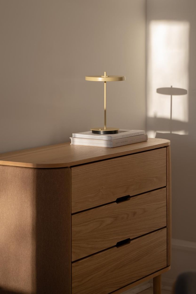Asteria Move heeft vier lichtsterktes die je kunt instellen met een druk op de knop aan de voet van de lamp. De batterij van de Asteria Move gaat tot wel 35 uur mee en kan eenvoudig worden opgeladen door hem op een Qi-oplaadstation te plaatsen, zoals de Unifier uit de UMAGE-accessoirecollectie, of met de meegeleverde USB-kabel.