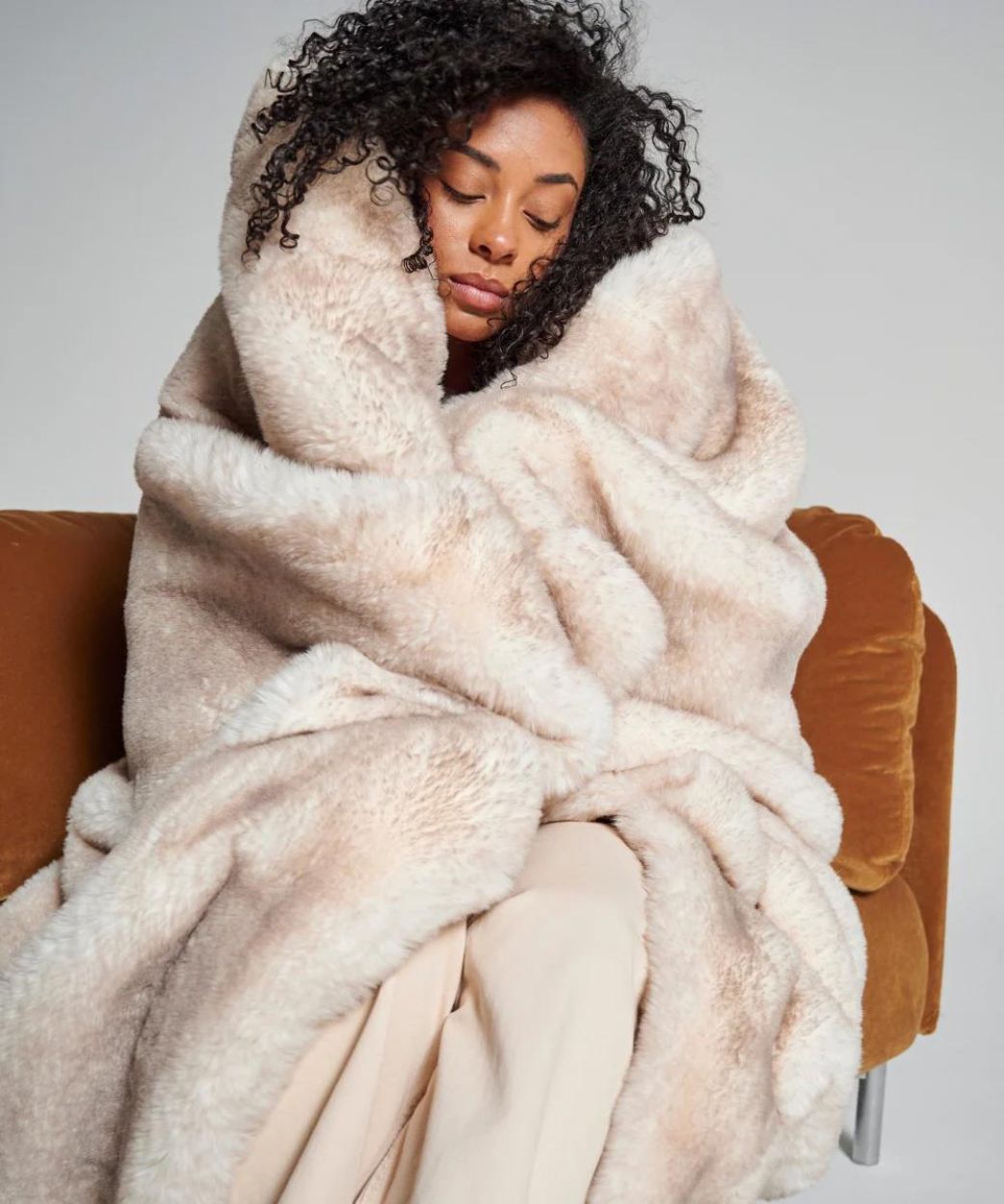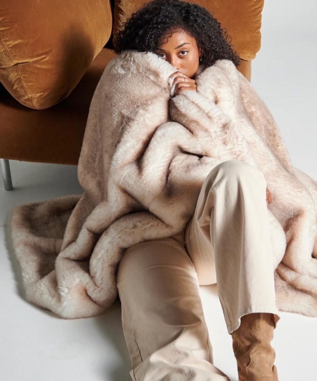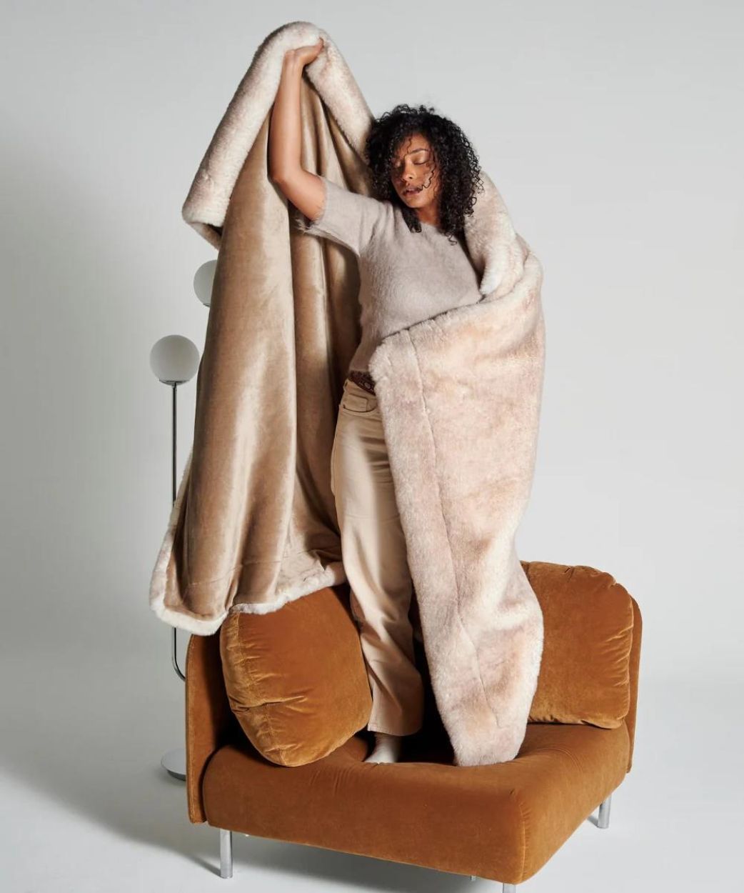 De voorzijde is uitgevoerd in langharig imitatiebont met een natuurlijke schakering van lichte en donkere beigetinten. De rijke, pluizige structuur vangt het licht en geeft het plaid een vol en levendig reliëf. Het nodigt uit tot aanraken en straalt warmte en zachtheid uit.