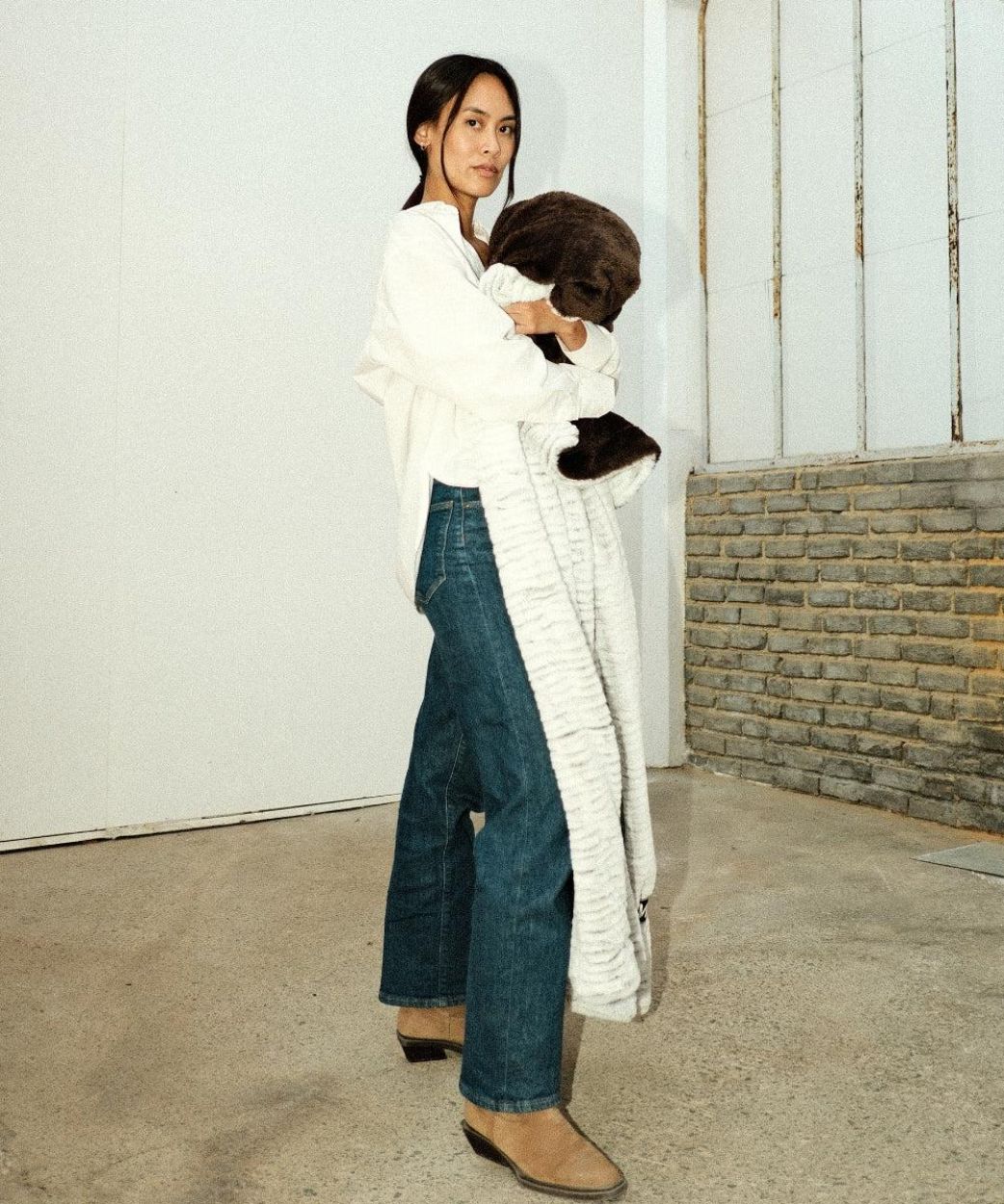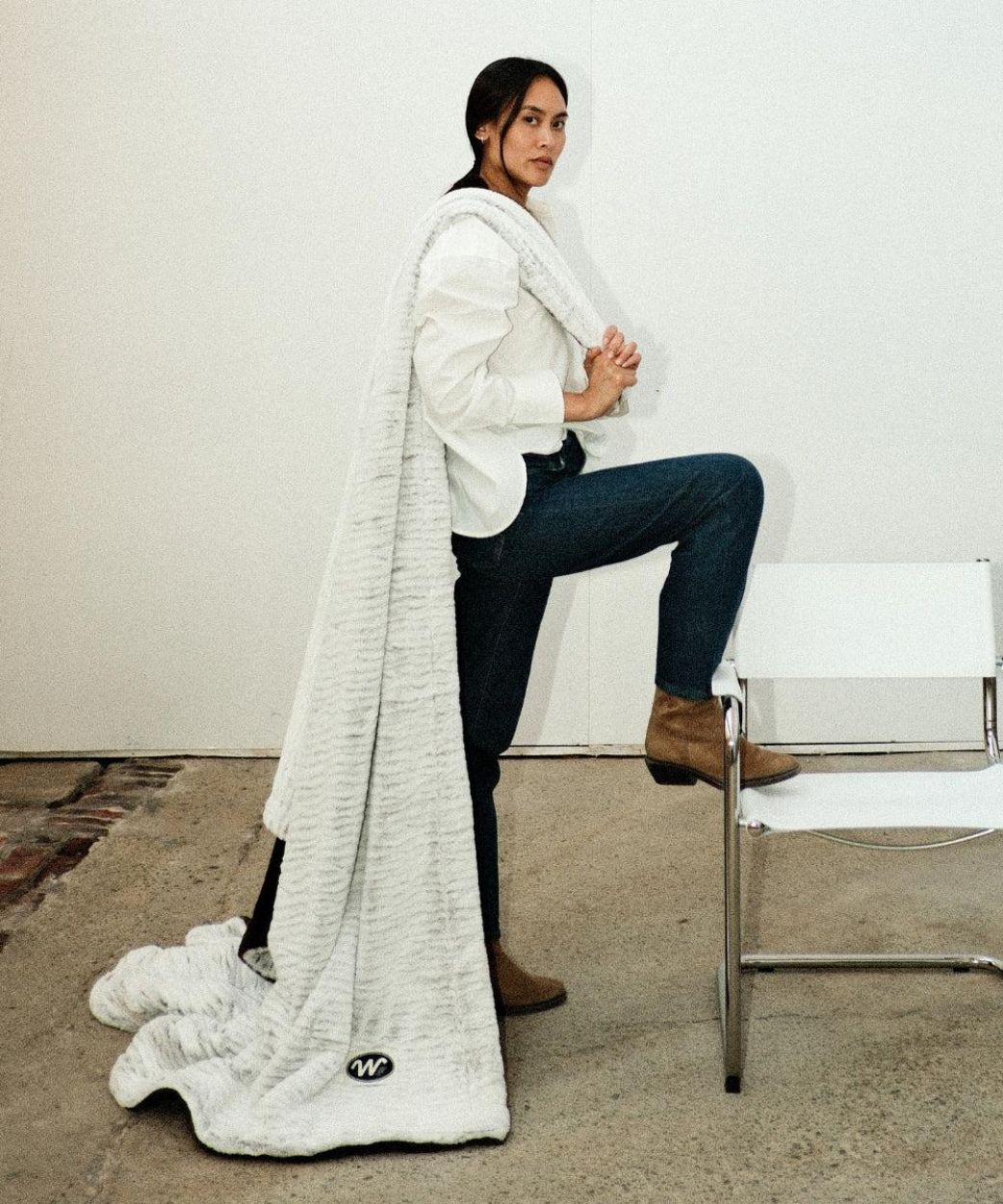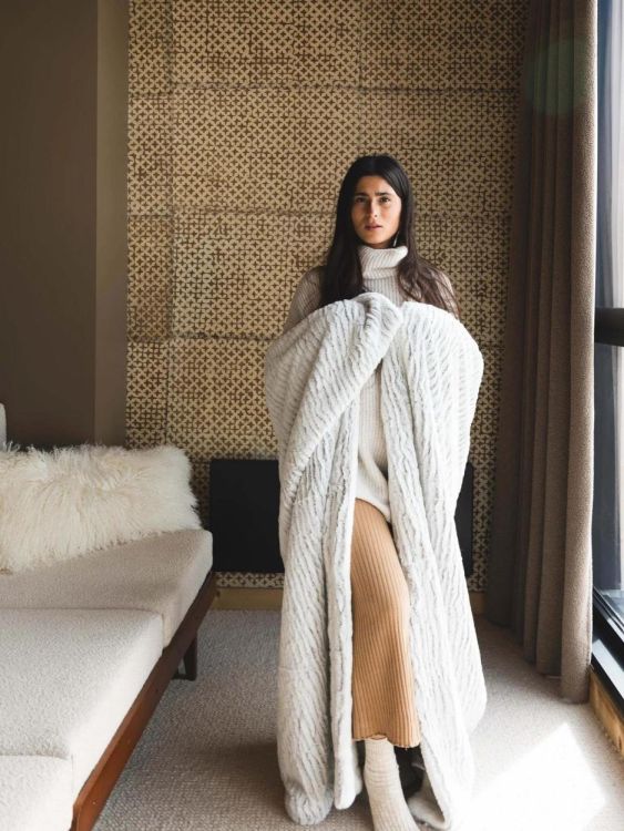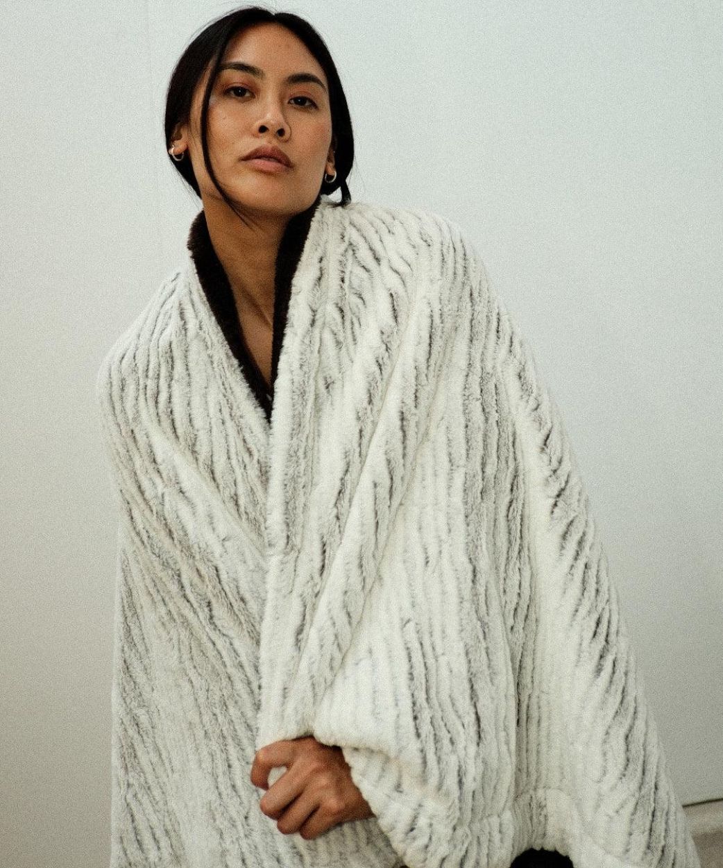 De voorzijde in wit is bewerkt met een golvend reliëf dat het licht op een verfijnde manier vangt. De afwisseling van lange en korte vezels creëert een subtiele beweging in het oppervlak en geeft het plaid een sculpturaal karakter.