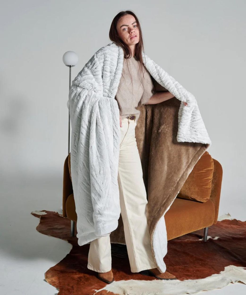 De voorzijde toont een grafisch tijgerpatroon in beige tinten dat structuur en karakter toevoegt, terwijl de achterzijde in effen, glanzende fleece rust en helderheid brengt. Afhankelijk van de stemming kun je kiezen voor een uitgesproken of juist ingetogen uitstraling.